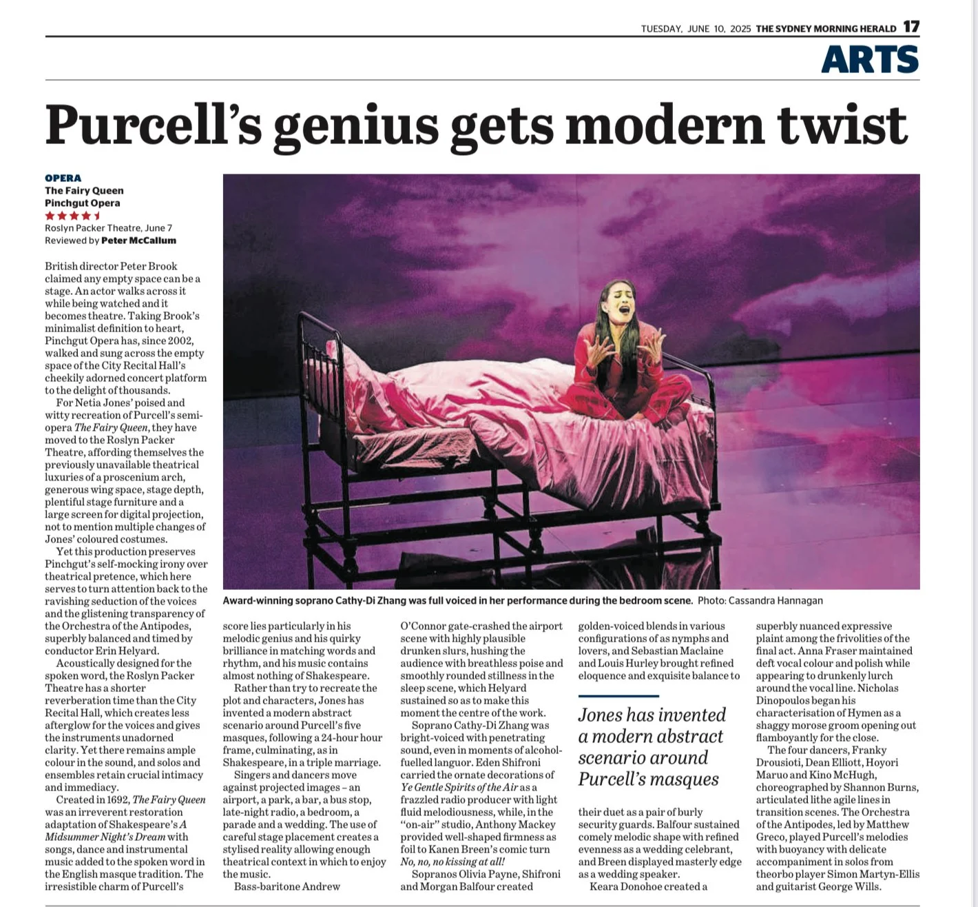”…young Australian-Hungarian soprano Eden Shifroni impressed in her debut in multiple roles, notably with “If Love’s a sweet passion, why does it torment?” for which she appeared as a lovelorn floor manager whose passion for the radio announcer is ignored.”