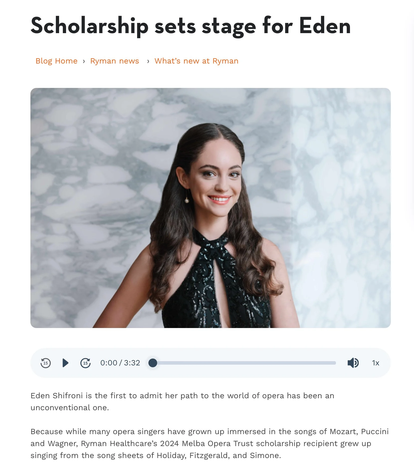 “While she has her eyes set on the opera halls of Europe and a dream role as Susanna in Mozart’s The Marriage of Figaro, Eden is equally excited by her short-term goals to make opera more accessible to younger audiences and to perform for Ryman residents.”