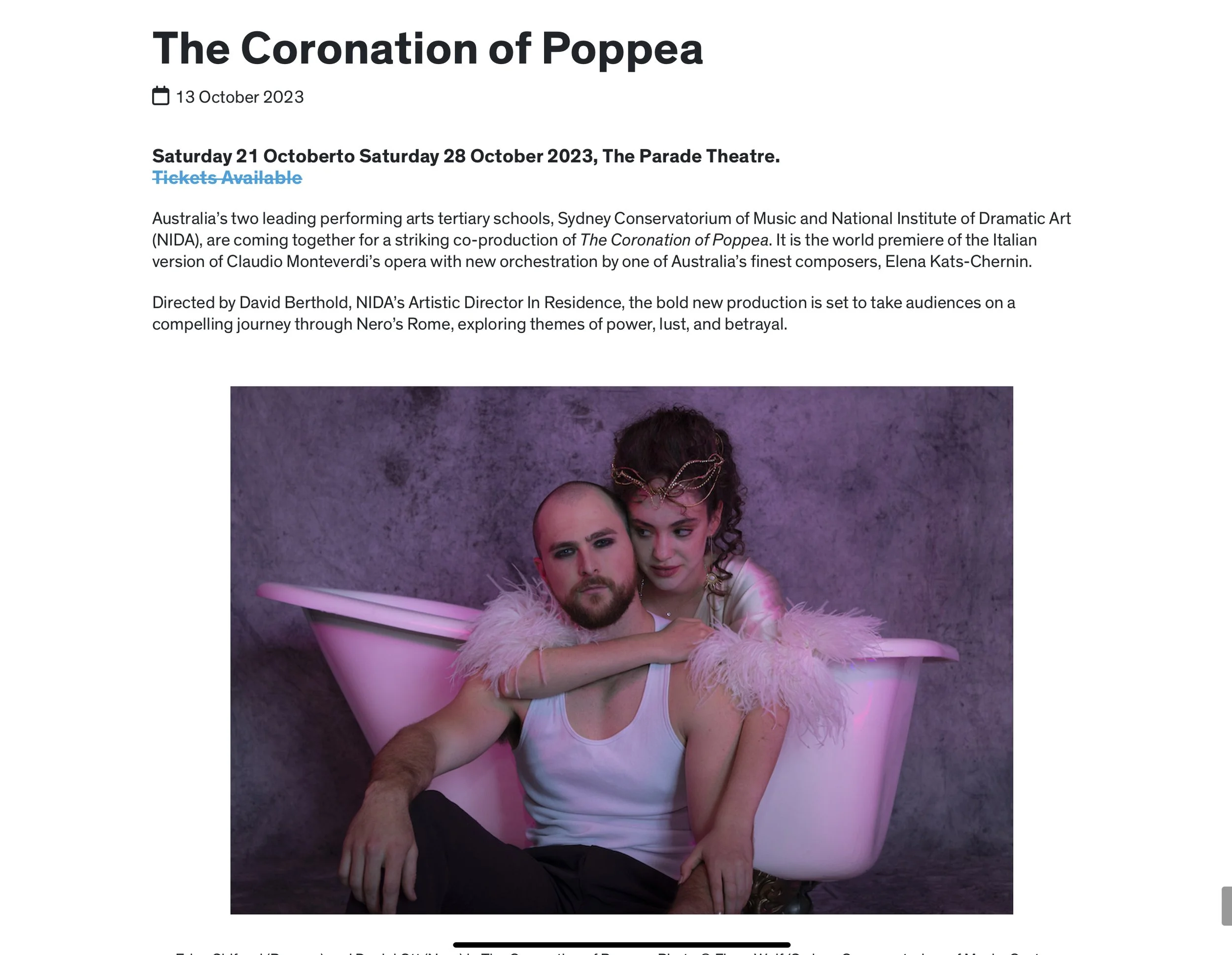 “Australia’s two leading performing arts tertiary schools, Sydney Conservatorium of Music and National Institute of Dramatic Art (NIDA), are coming together for a striking co-production of The Coronation of Poppea. It is the world premiere of the Italian version of Claudio Monteverdi’s opera with new orchestration by one of Australia’s finest composers, Elena Kats-Chernin… The role of Poppea is played by Eden Shifroni, a promising young singer who made the move from jazz to opera.”