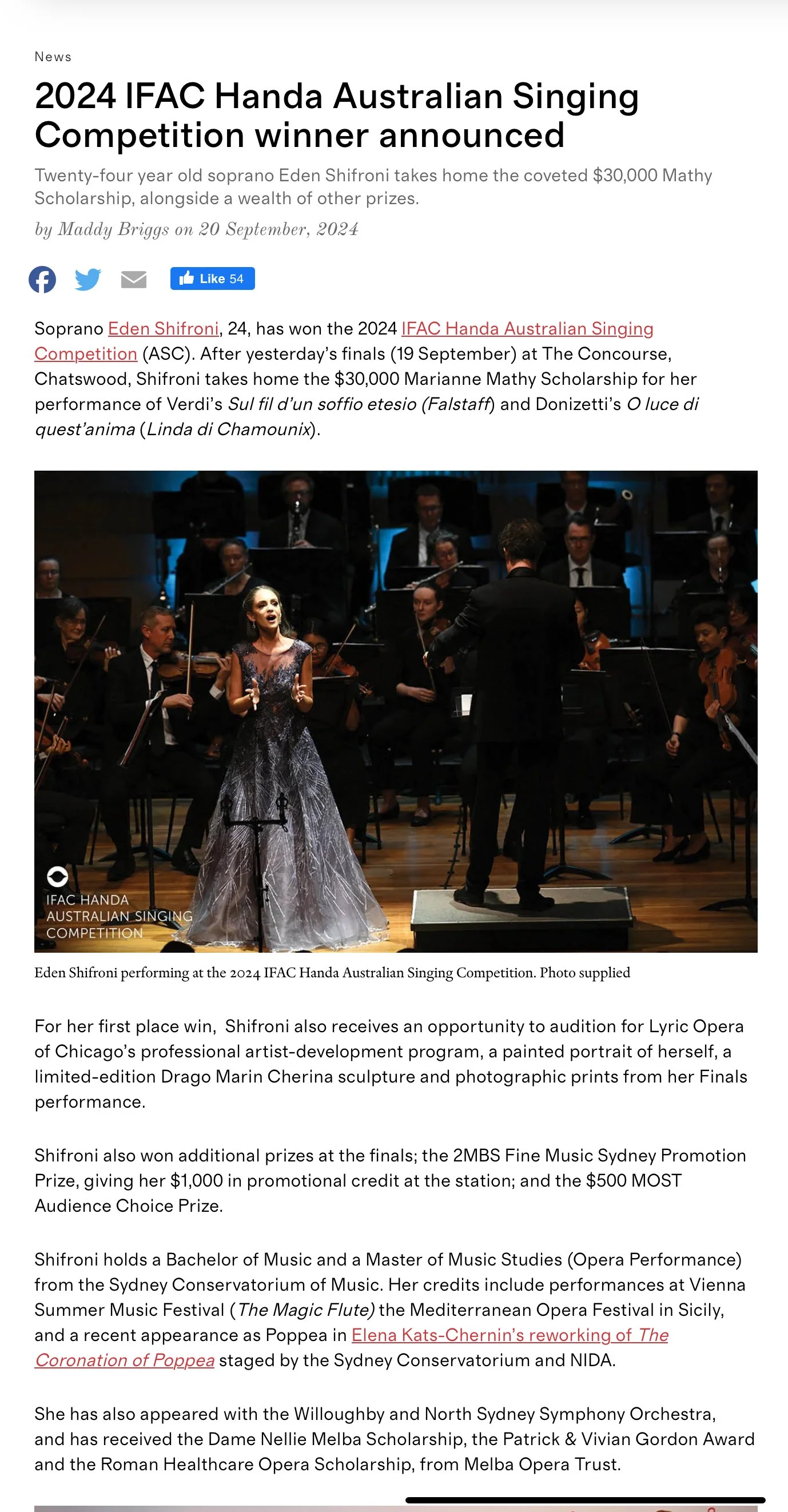 “Soprano Eden Shifroni, 24, has won the 2024 IFAC Handa Australian Singing Competition (ASC). After yesterday’s finals (19 September) at The Concourse, Chatswood, Shifroni takes home the $30,000 Marianne Mathy Scholarship for her performance of Verdi’s Sul fil d’un soffio etesio (Falstaff) and Donizetti’s O luce di quest’anima (Linda di Chamounix).”
